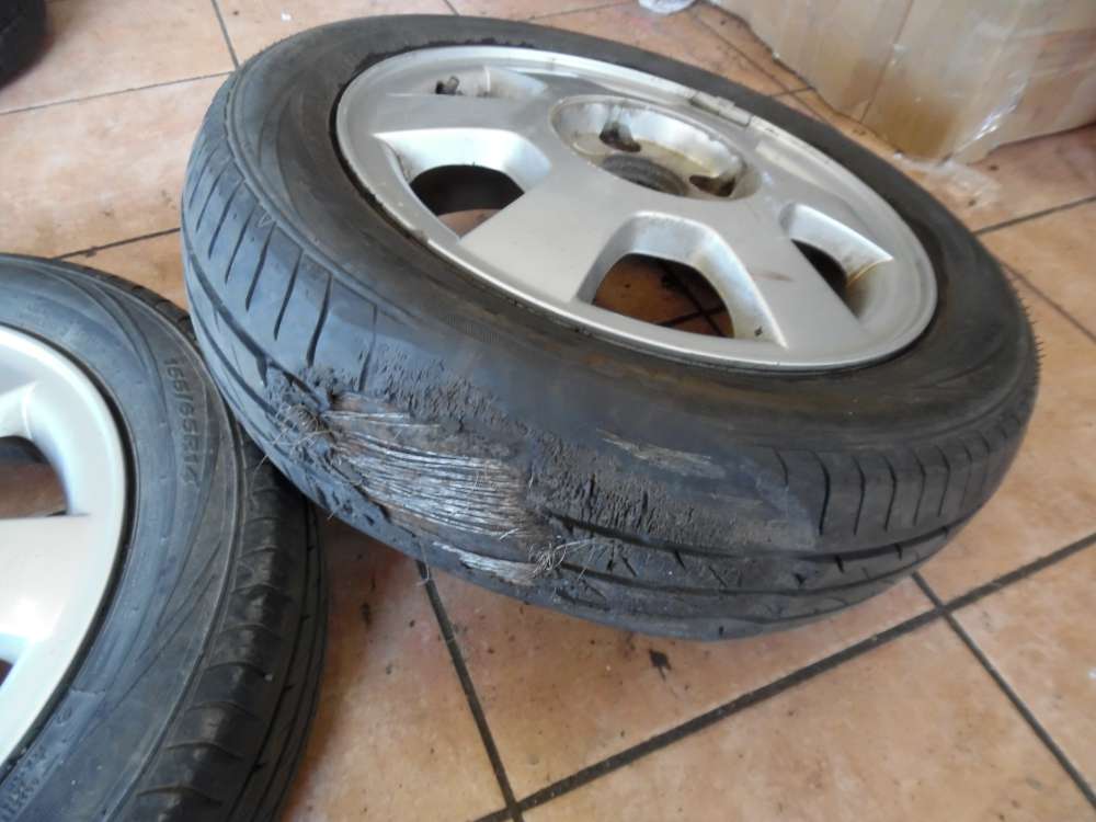 Reifenbreite : 155/65 R14 75T Profiltiefe: 5 mm Lochzahl : 5 Loch Felgenbreite : 4,5Jx14H2 ET : 45 EDOT : 0217 Die Alufelgen hat Gebrauchsspuren und Flugrost und nur ein Reifen zu verkaufen, ein Reifen ist defekt, Bitte Sehen Sie die Bilder an !!